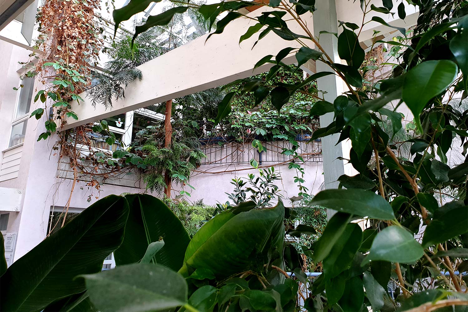 Das Ökohaus in Frankfurt ist nur wenige Gehminuten vom Frankfurter Messegelände entfernt und bietet mit seinen tropischen und einheimischen Pflanzen eine außergewöhnliche Atmosphäre für unsere Schaffenskraft. Großstädtisch zentral gelegen, biologisch orientierte Bauweise und ein natürliches Raumklima über das ganze Jahr.